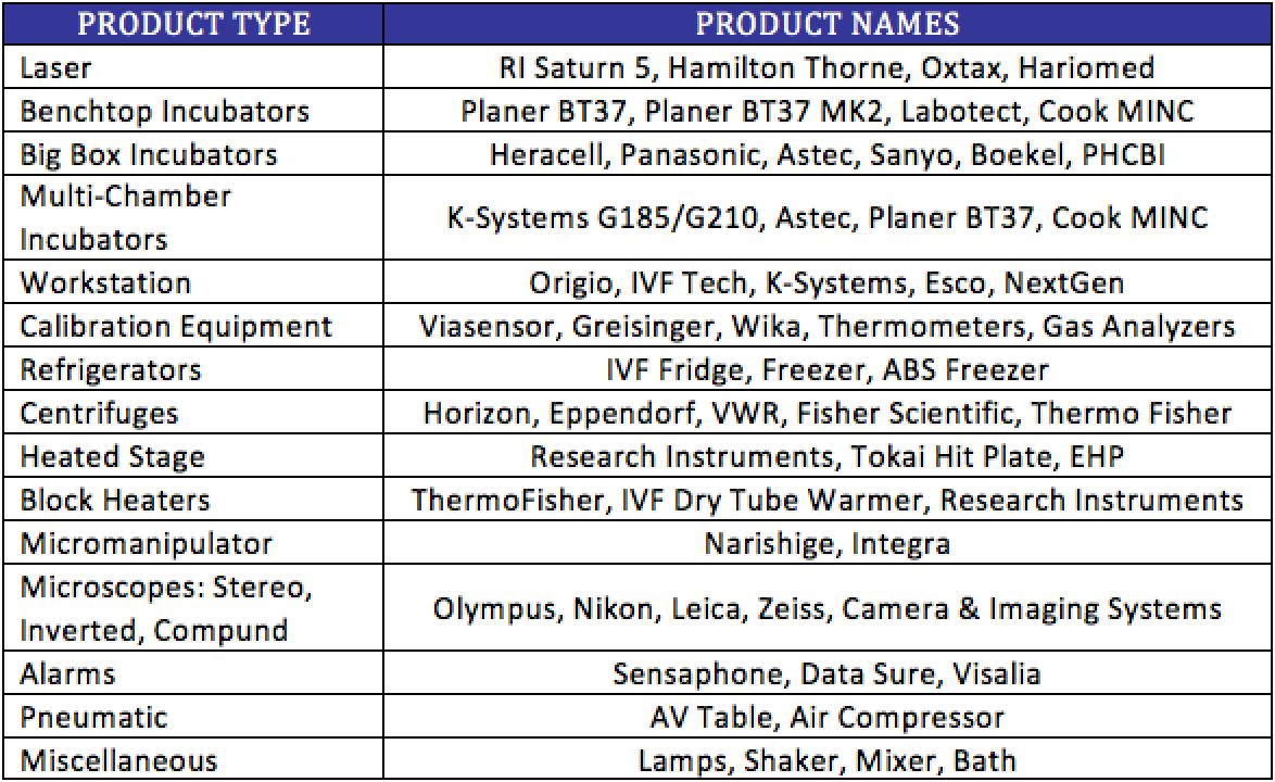 The following table outlines specific IVF equipment product types and associated names serviced by Nationwide.